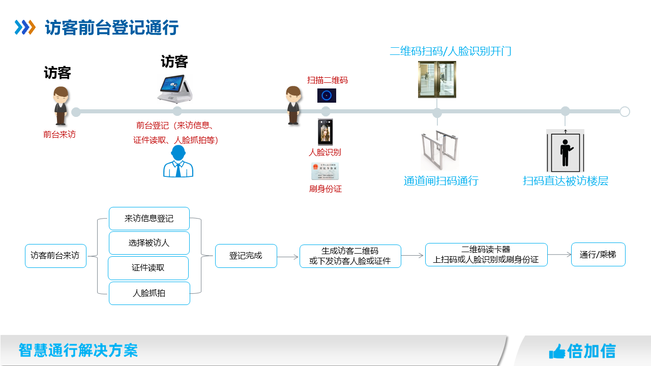 在住宅小區、寫字樓、園區、企事業單位等場所,物業往往針對外來人員都需要管控,我司提供多種訪客通行解決方案,滿足不同場景訪客進出物業管理需求。