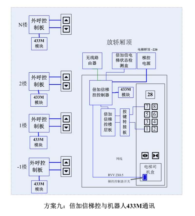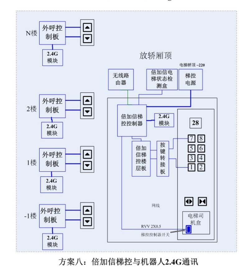 (1)機(jī)器人在電梯外,通個(gè)Wifi或4G網(wǎng)絡(luò)發(fā)送指令給倍加信梯控平臺(tái),倍加信梯控云平臺(tái)收到指令后,將指令發(fā)給倍加信梯控系統(tǒng),倍加信梯控系統(tǒng)自動(dòng)點(diǎn)亮上樓或下樓按鍵,實(shí)現(xiàn)呼梯功能。