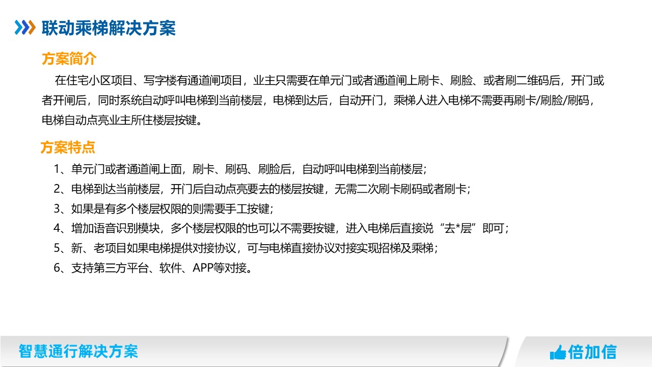 1、單元門或者通道閘上面,刷卡、刷碼、刷臉后,自動呼叫電梯到當(dāng)前樓層;