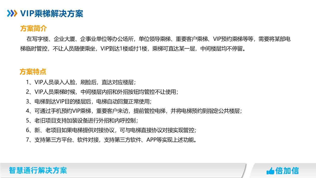 在寫字樓、企業大廈、企事業單位等辦公場所,單位領導乘梯、重要客戶乘梯、VIP預約乘梯等等,需要將某部電梯臨時管控,不讓人員隨便乘坐,VIP到達1樓或付1樓,乘梯可直達某一層,中間樓層均不停留。