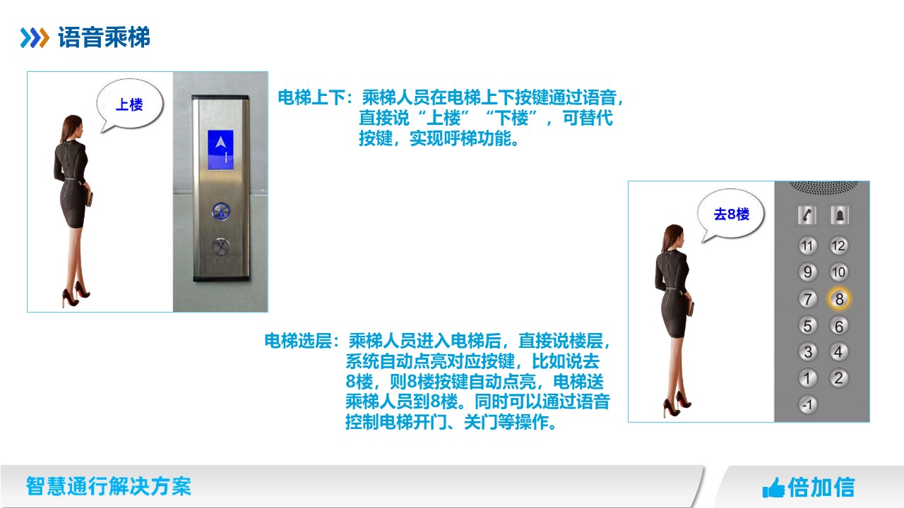 電梯上下:電梯一般都需要按電梯外面上下按鍵實現呼梯,倍加信語音識別乘梯方案,乘梯人員在電梯上下按鍵通過語音,直接說“我要上樓”“我要下樓”可替代按鍵,實現呼梯功能。